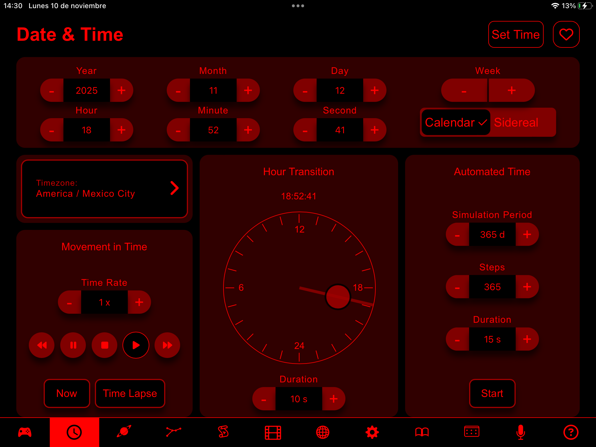 Note que los colores de la interfase ayudan a mantener la visión del usuario adaptada a la oscuridad y mitiga el efecto dentro del domo. Para ajustar gradualmente la latitud, longitud, altitud, dirección de la vista, simplemente moviendo la bala circular sobre las barras a la derecha para incrementar o a la izquierda para reducirlo. Mientras más lo mueva del centro, el valor se moverá con mayor velocidad. Para ingresar un número exacto, puede editar el ajuste con el teclado (físico o en pantalla). La función de control de tiempo es como una control remoto de un DVD. Todas las funciones del control remoto también están disponibles en la Consola Universal, y las dos pueden utilizarse al mismo tiempo. Entre las funciones adicionales de la Consola Universal se incluyen: